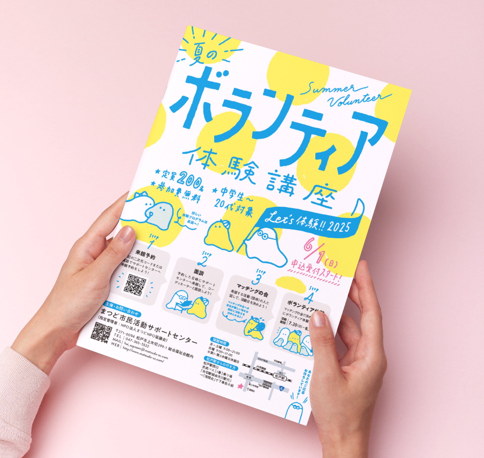 松戸市の若者向けボランティア体験講座「Let's体験!2025」のチラシデザインを担当しました。夏休みに遊びの延長線上で友達と気楽に参加できるようなカジュアルさを全面に出しています。